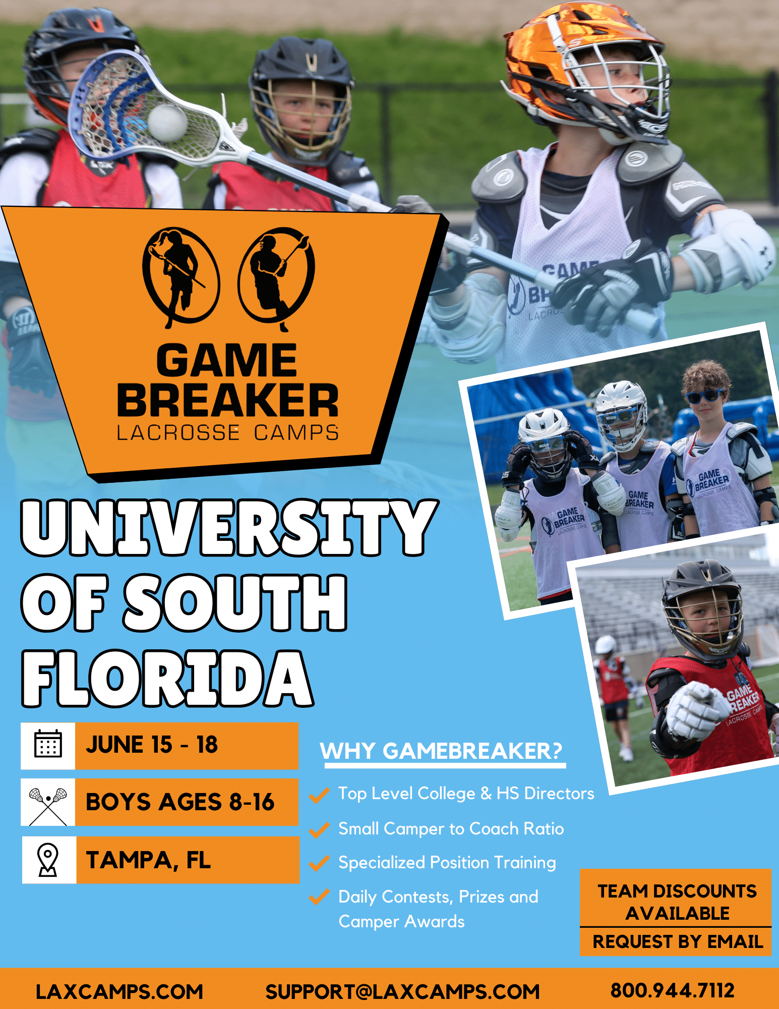 GameBreaker Lacrosse Camps returns to South Florida for an exciting boys’ summer lacrosse camp. This camp offers top-notch facilities, including comfortable dormitories, an all-you-can-eat dining hall, and multiple fields with both grass and/or turf surfaces. Campers will focus on improving individual stick skills and positional techniques, learning team concepts, and participating in daily scrimmages to apply what they’ve learned. Both overnight and extended day camper options are available, making it flexible for participants. With excellent training, great amenities, and an engaging environment, this camp is the perfect opportunity for young athletes to enhance their lacrosse skills and have a memorable summer experience.