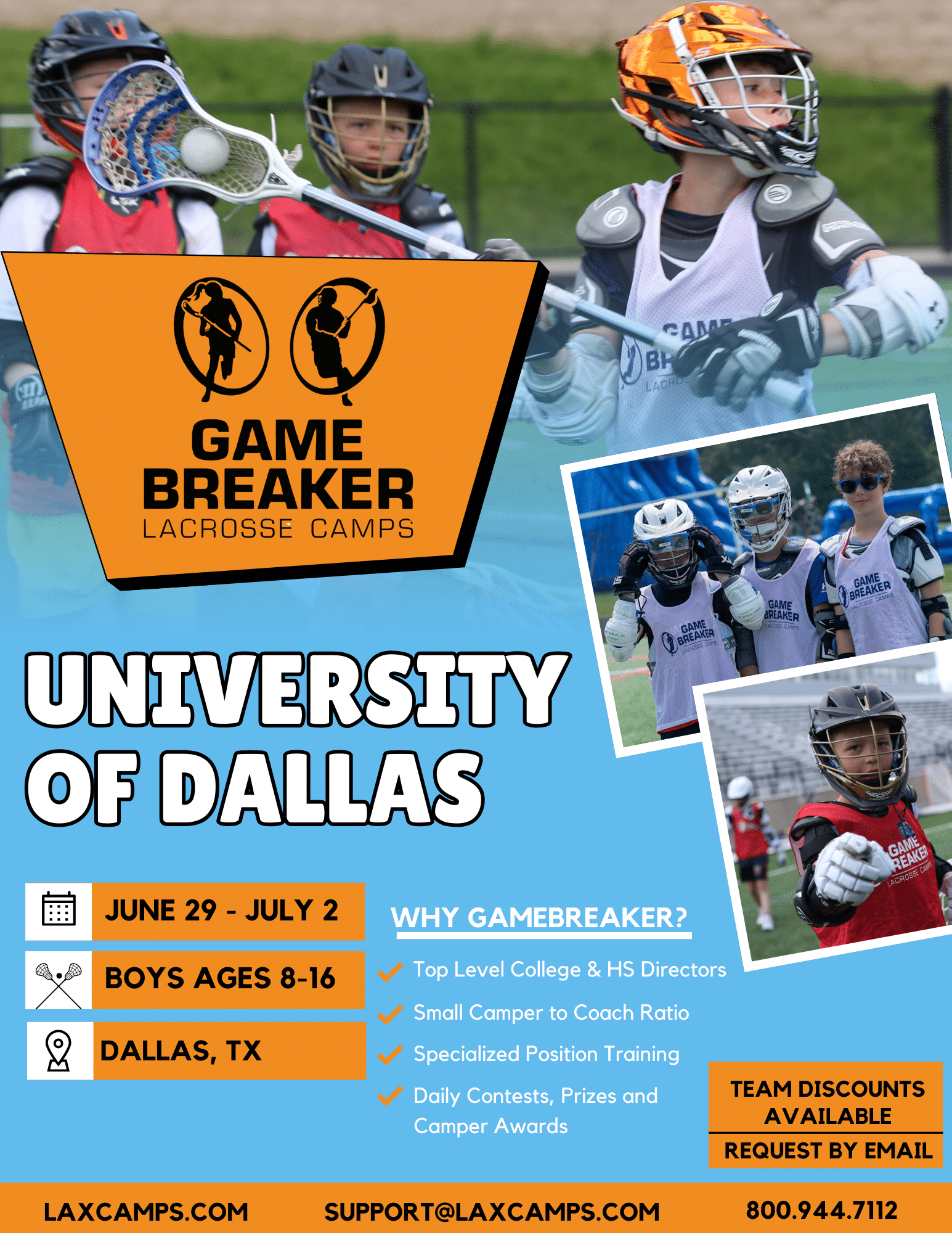 GameBreaker Lacrosse Camps returns to Texas at the University of Dallas for an exciting boys’ summer lacrosse camp. This camp offers top-notch facilities, including comfortable dormitories, an all-you-can-eat dining hall, and multiple fields with both grass and/or turf surfaces. Campers will focus on improving individual stick skills and positional techniques, learning team concepts, and participating in daily scrimmages to apply what they’ve learned. Both overnight and extended day camper options are available, making it flexible for participants. With excellent training, great amenities, and an engaging environment, this camp is the perfect opportunity for young athletes to enhance their lacrosse skills and have a memorable summer experience.