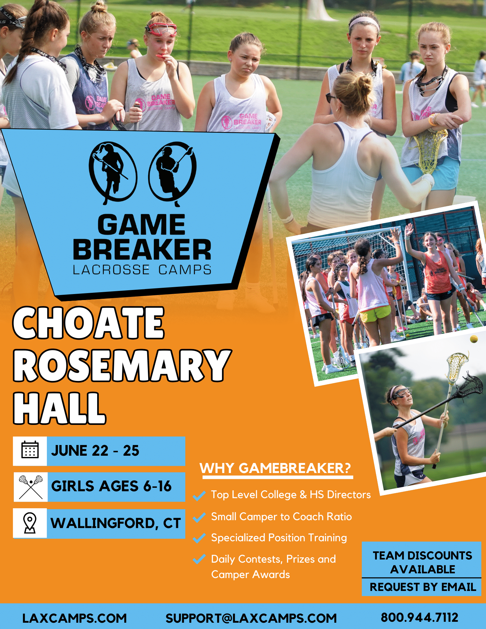 GameBreaker Lacrosse Camps is proud to return to Choate Rosemary Hall in Wallingford, Connecticut, for an action-packed girls’ summer lacrosse camp. Designed to enhance individual stick skills, positional techniques, and team concepts, the camp also features daily scrimmages to help players put their training into practice. With flexible options for both full-day and half-day campers, this program accommodates a variety of schedules. Combining top-notch coaching, excellent facilities, and a fun, engaging atmosphere, this camp is an ideal opportunity for young athletes to improve their game and create lasting summer memories.