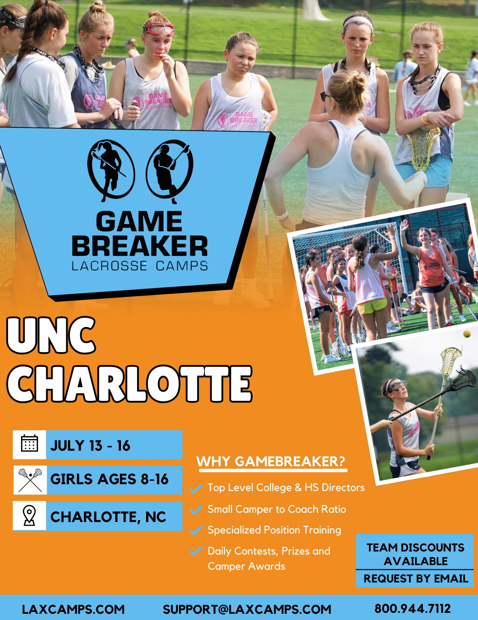 GameBreaker Lacrosse Camps returns to UNC Charlotte in North Carolina for an exciting girls’ summer lacrosse camp. This camp offers top-notch facilities, including comfortable dormitories, an all-you-can-eat dining hall, and multiple fields with both grass and or turf surfaces. Campers will focus on improving individual stick skills and positional techniques, learning team concepts, and participating in daily scrimmages to apply what they’ve learned. Both overnight and extended day camper options are available, making it flexible for participants. With excellent training, great amenities, and an engaging environment, this camp is the perfect opportunity for young athletes to enhance their lacrosse skills and have a memorable summer experience.