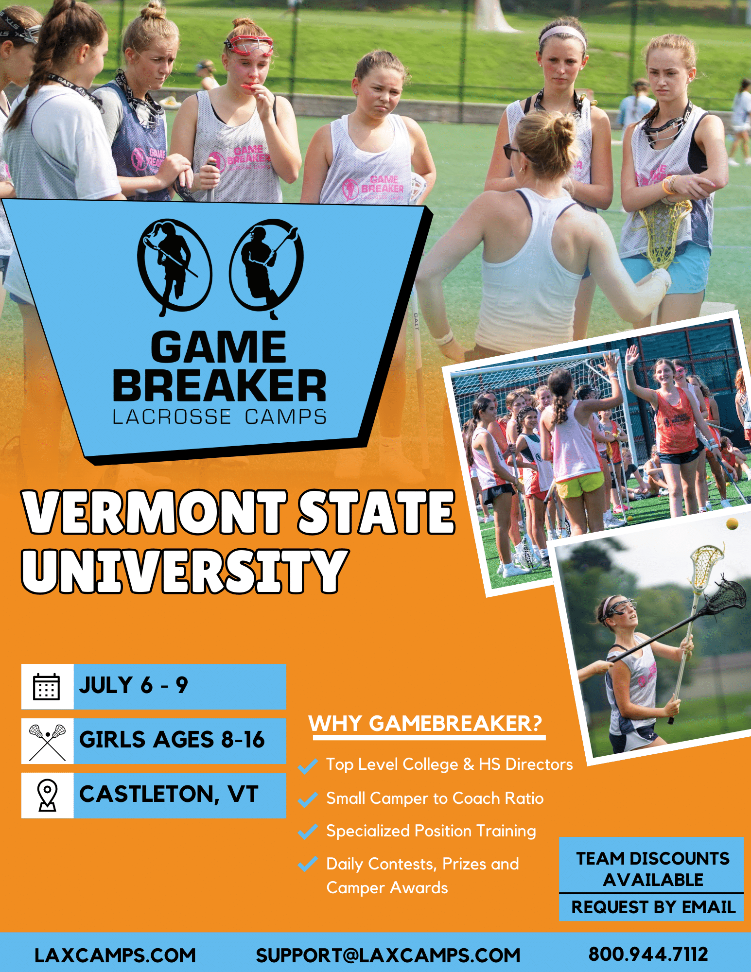 GameBreaker Lacrosse Camps returns to Vermont in for an exciting girls’ summer lacrosse camp at Castleton University. This camp offers top-notch facilities, including comfortable dormitories, an all-you-can-eat dining hall, and multiple fields with both grass and or turf surfaces. Campers will focus on improving individual stick skills and positional techniques, learning team concepts, and participating in daily scrimmages to apply what they’ve learned. Both overnight and extended day camper options are available, making it flexible for participants. With excellent training, great amenities, and an engaging environment, this camp is the perfect opportunity for young athletes to enhance their lacrosse skills and have a memorable summer experience.