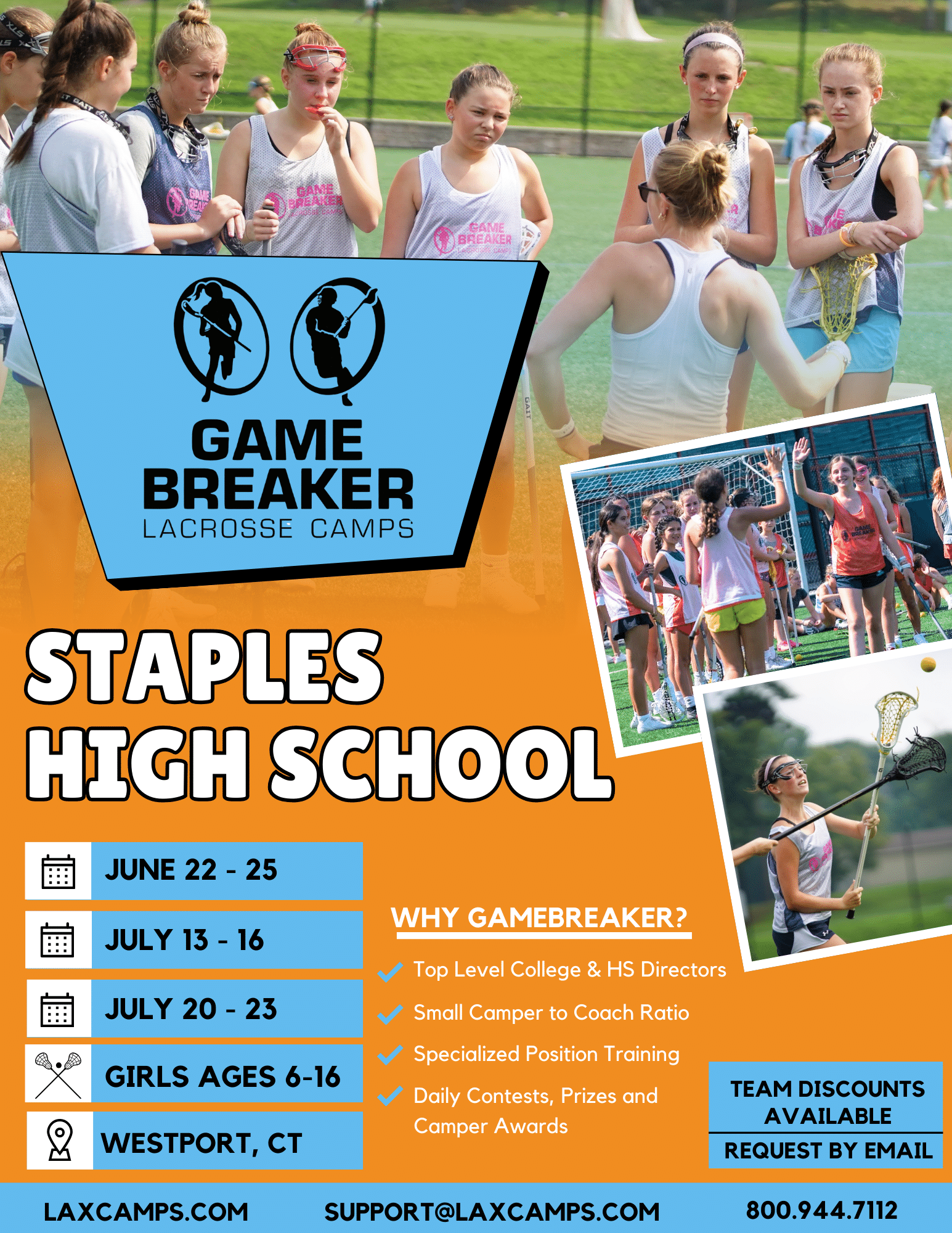 GameBreaker Lacrosse Camps is proud to return to Westport Connecticut, for action-packed girls’ summer lacrosse camps. Designed to enhance individual stick skills, positional techniques, and team concepts, the camp also features daily scrimmages to help players put their training into practice. Combining top-notch coaching, excellent facilities, and a fun, engaging atmosphere, this camp is an ideal opportunity for young athletes to improve their game and create lasting summer memories.
